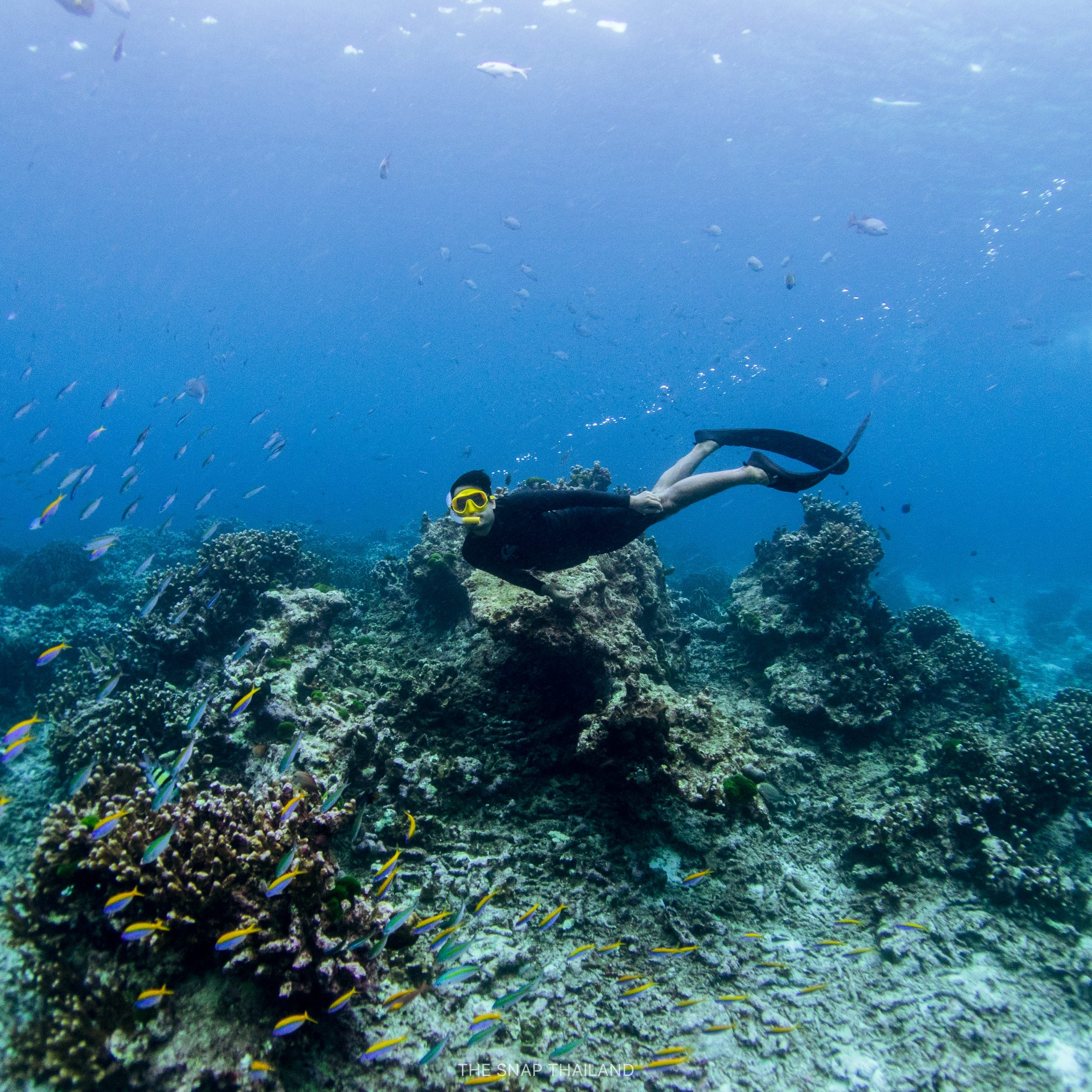 Final snorkeling stop at one the richest shallow reefs in the Similan Islands, dense with lettuce coral and a variety of colorful fish.